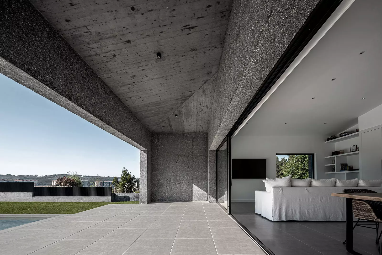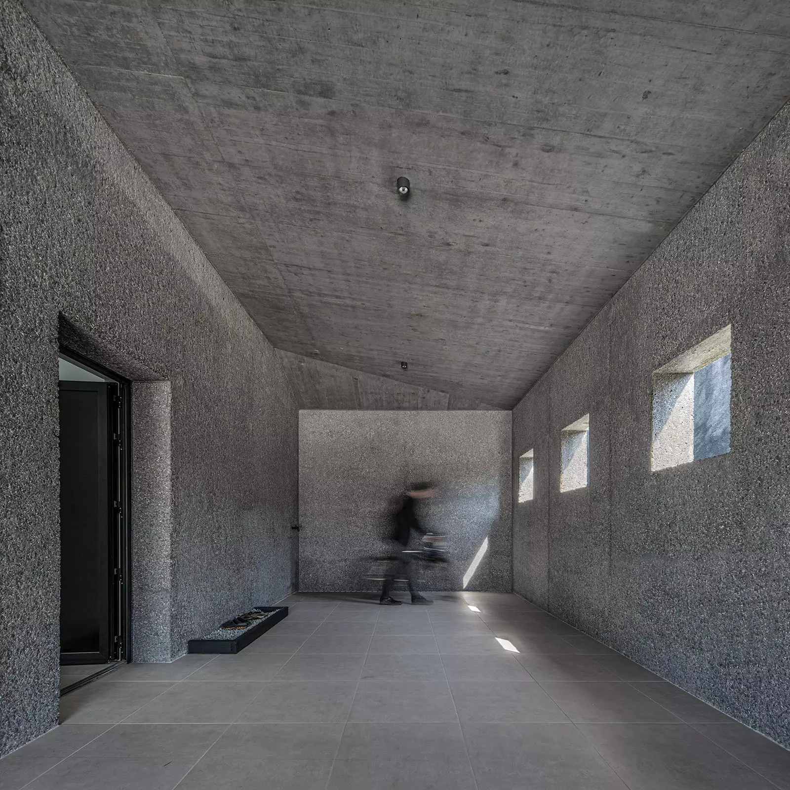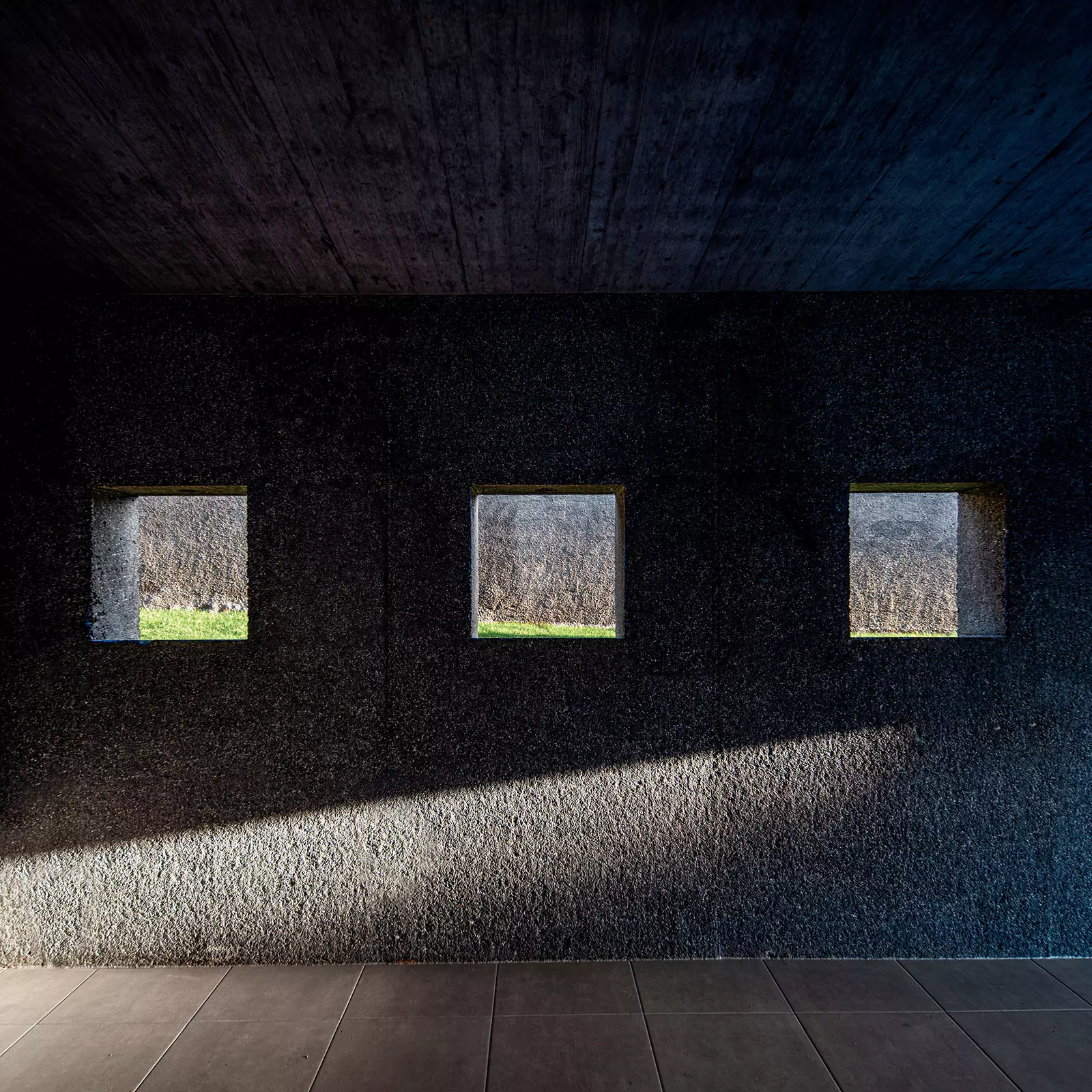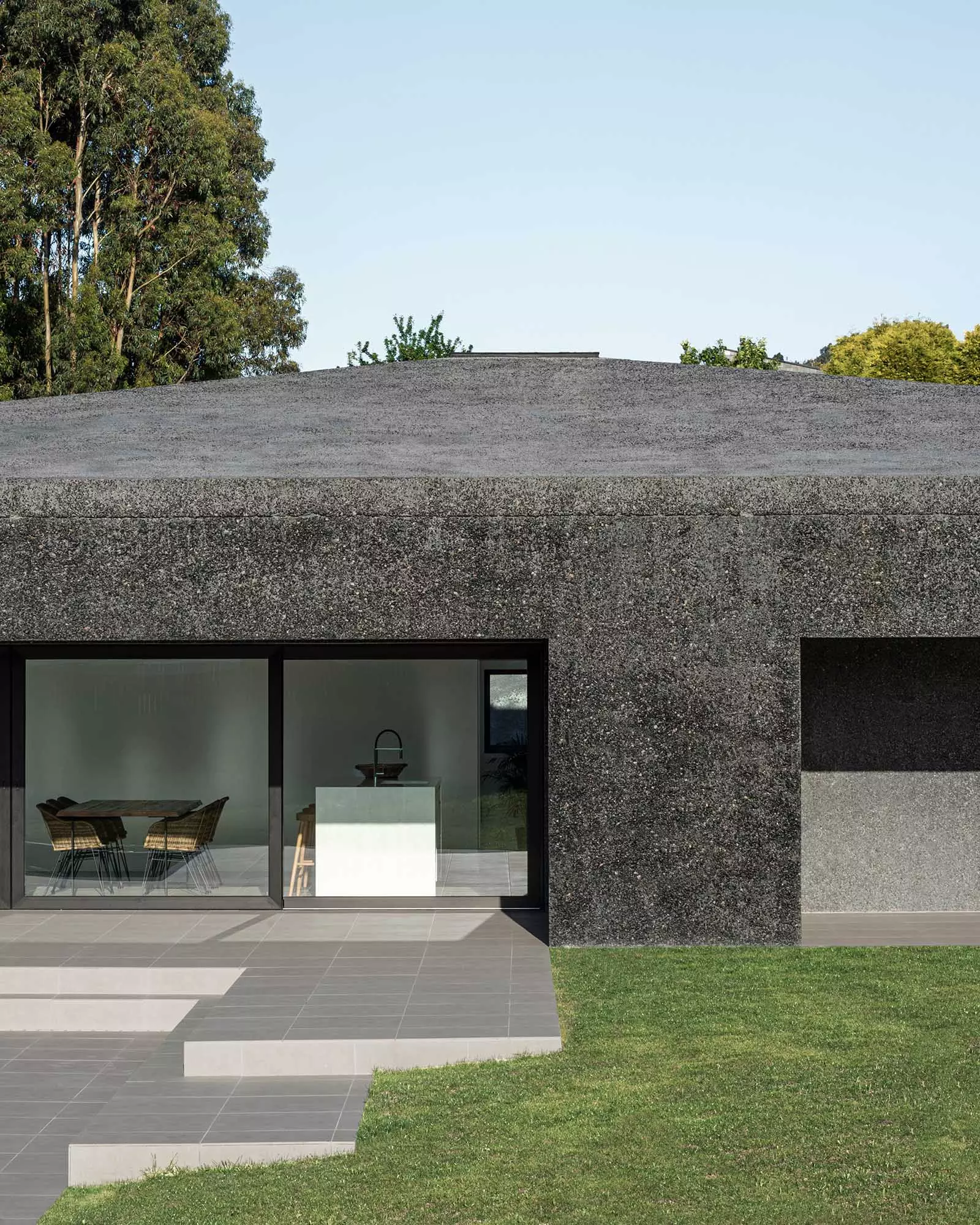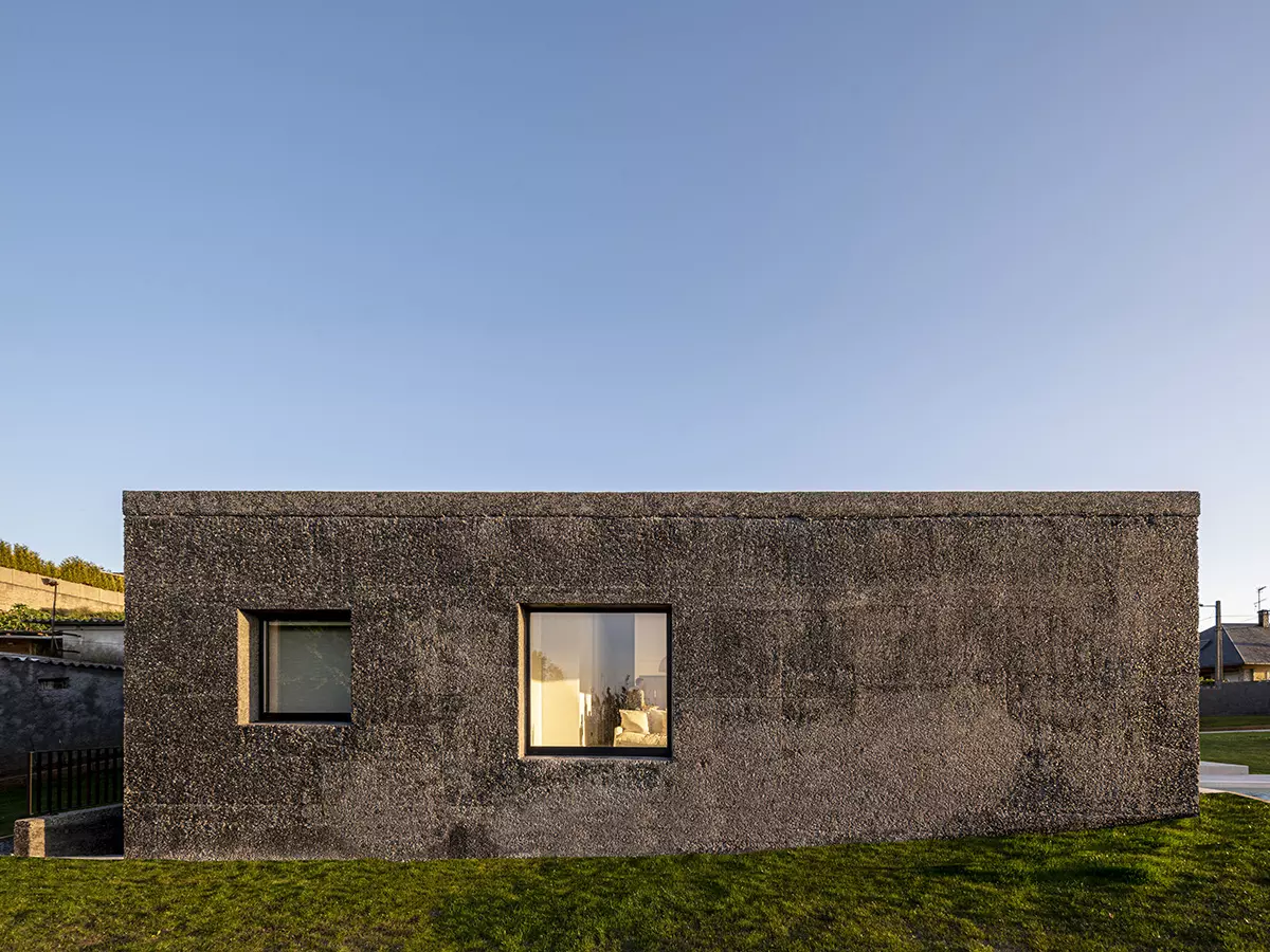 La materialidad de los muros continúa en toda la cubierta creando un volumen cuya textura va suavizándose progresivamente hacia el interior con un matiz en el hormigón casi textil. Nos parece muy interesante ver la naturaleza del material, mostrar su composición como lo haría cada dovela de un arco. Este hormigón tiene áridos oscuros con matices verdes y blancos que intentan generar una relación con el entorno natural, así como darle una escala más humana al conjunto. El tiempo hará envejecer a la casa y le dará una pátina similar a las casas tradicionales de piedra.