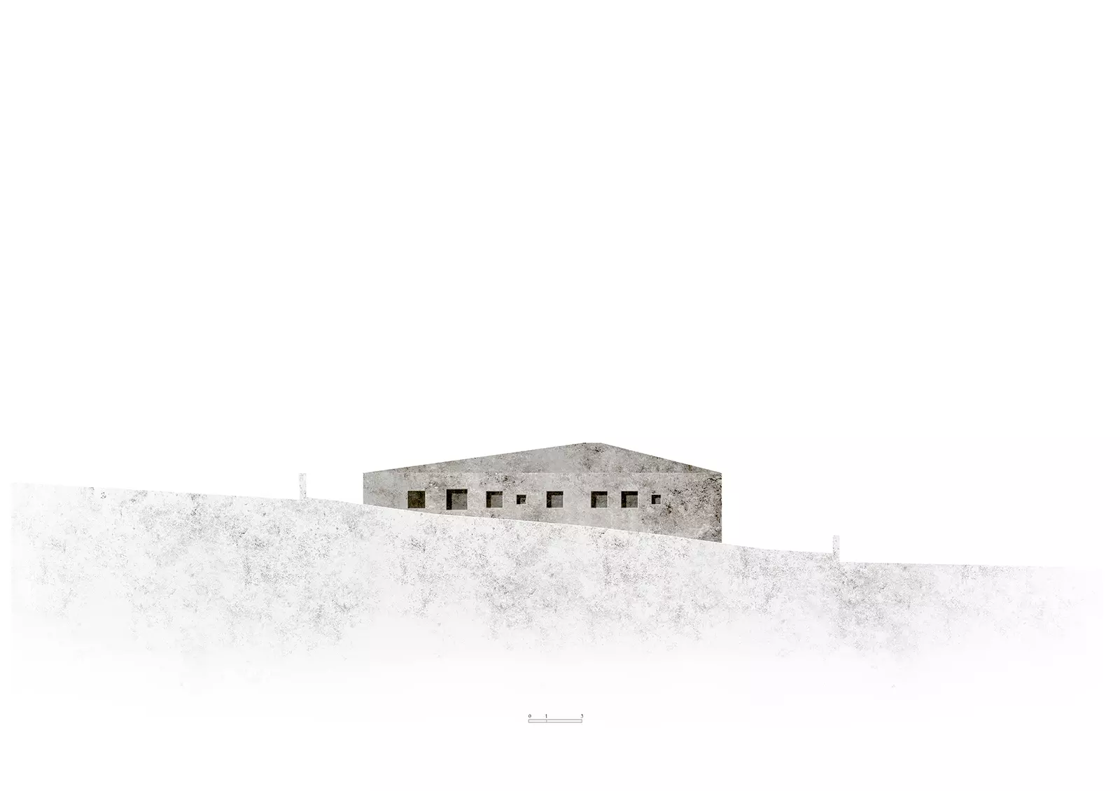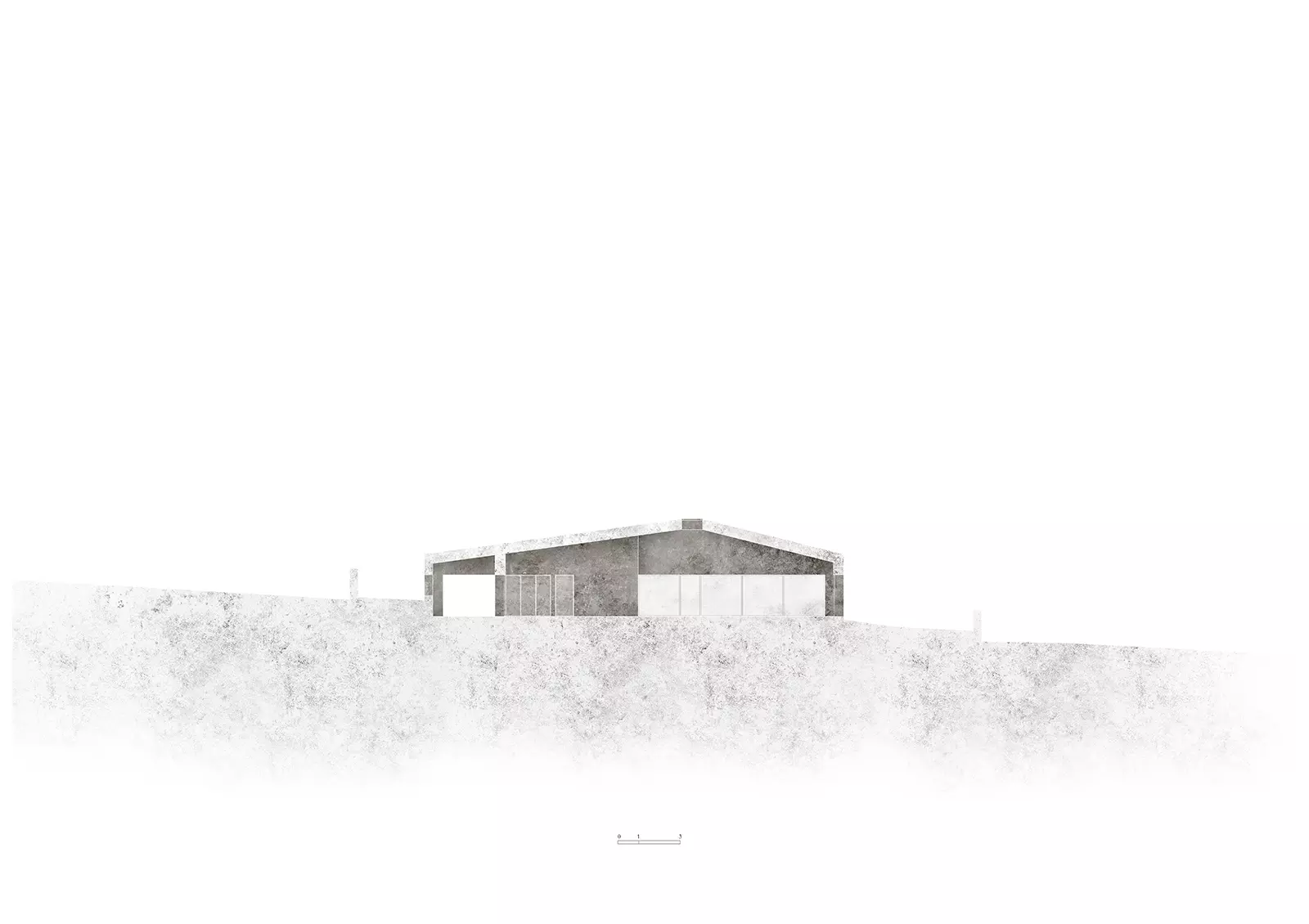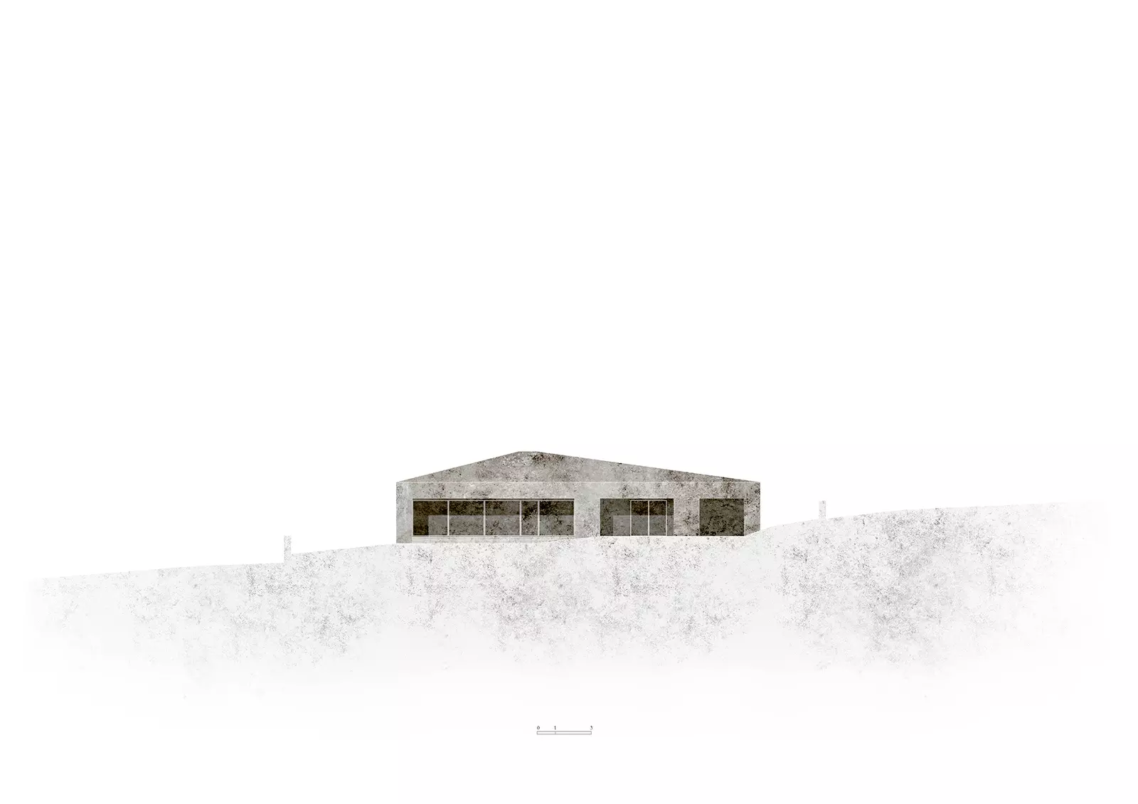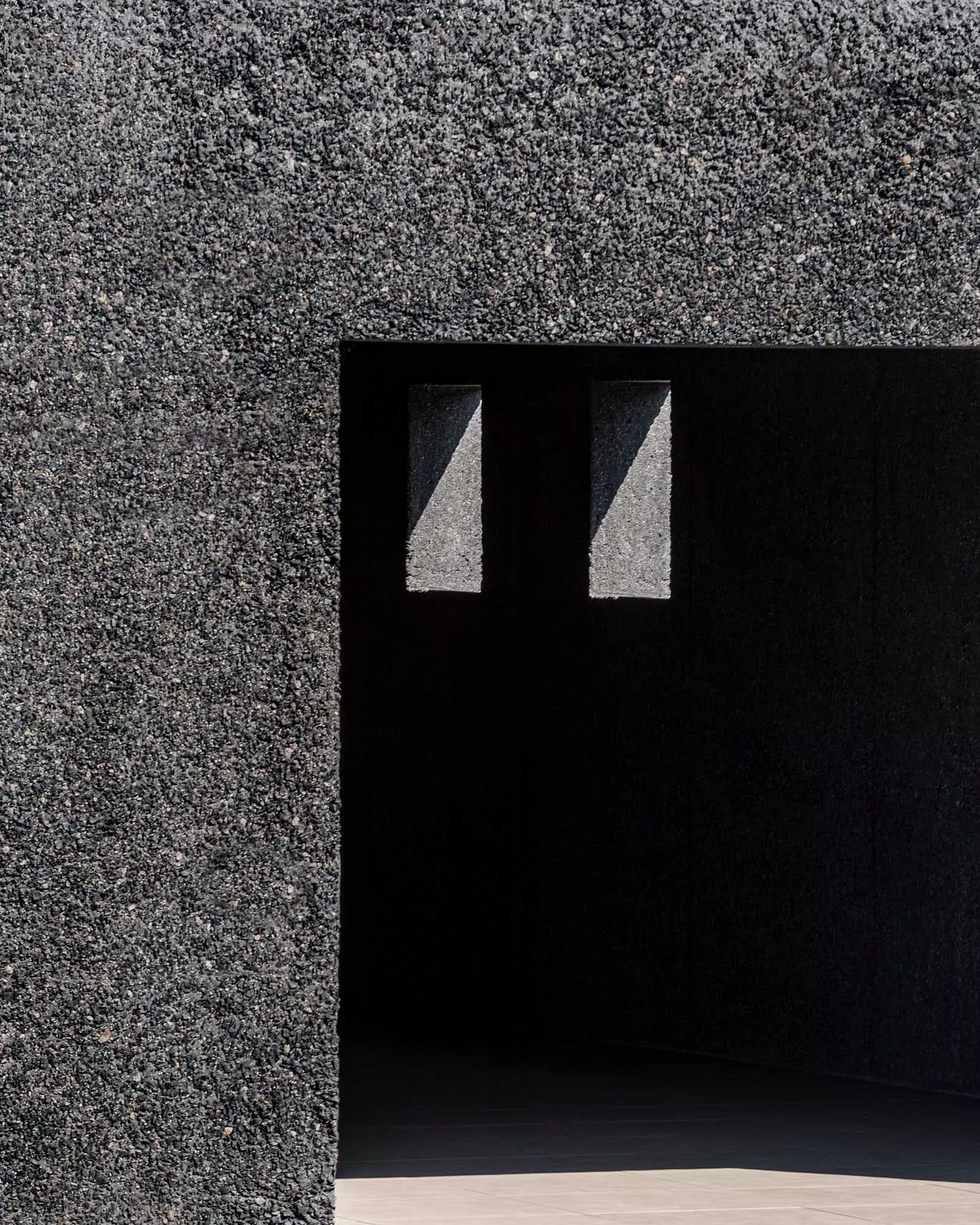 La materialidad de los muros continúa en toda la cubierta creando un volumen cuya textura va suavizándose progresivamente hacia el interior con un matiz en el hormigón casi textil. Nos parece muy interesante ver la naturaleza del material, mostrar su composición como lo haría cada dovela de un arco. Este hormigón tiene áridos oscuros con matices verdes y blancos que intentan generar una relación con el entorno natural, así como darle una escala más humana al conjunto. El tiempo hará envejecer a la casa y le dará una pátina similar a las casas tradicionales de piedra.