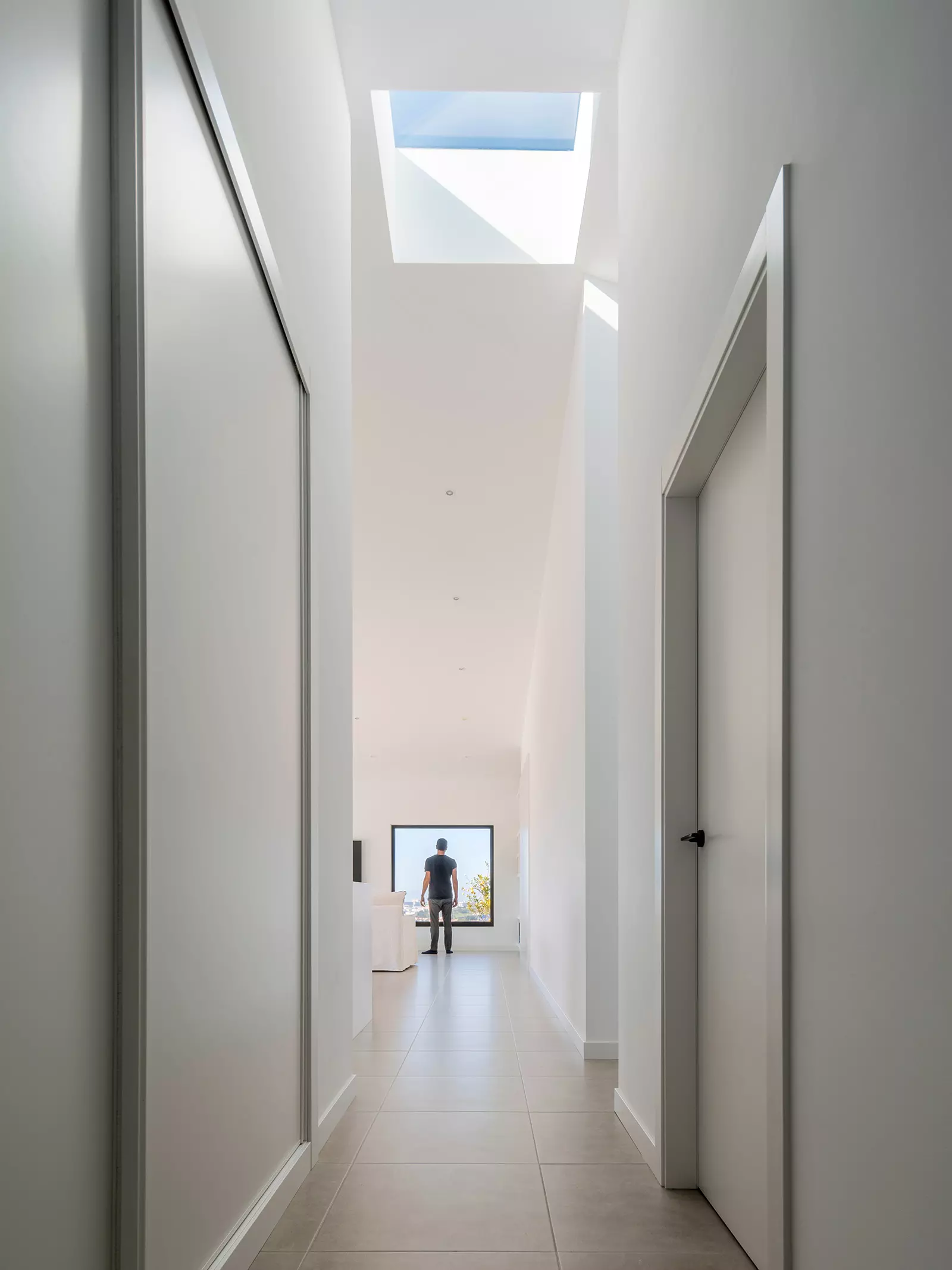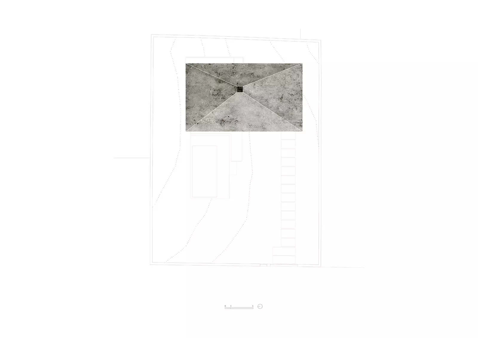 Dentro de la protección que produce esta arquitectura tan primitiva, buscamos otras sensaciones básicas y agradables en el ser humano como la luz que nos cae desde arriba en la zona de día. La luz cenital marca la intersección de los ejes cardo - decumano de la casa. Este punto divide la vivienda entre las distintas zonas de privacidad y recibe iluminación desde todas las orientaciones. Queremos crear un espacio íntimo y asimismo un espacio exterior.
