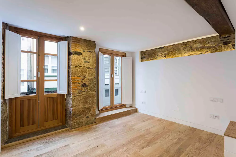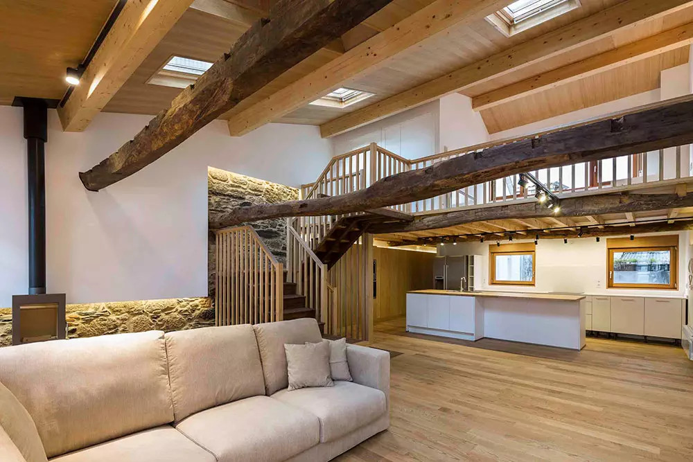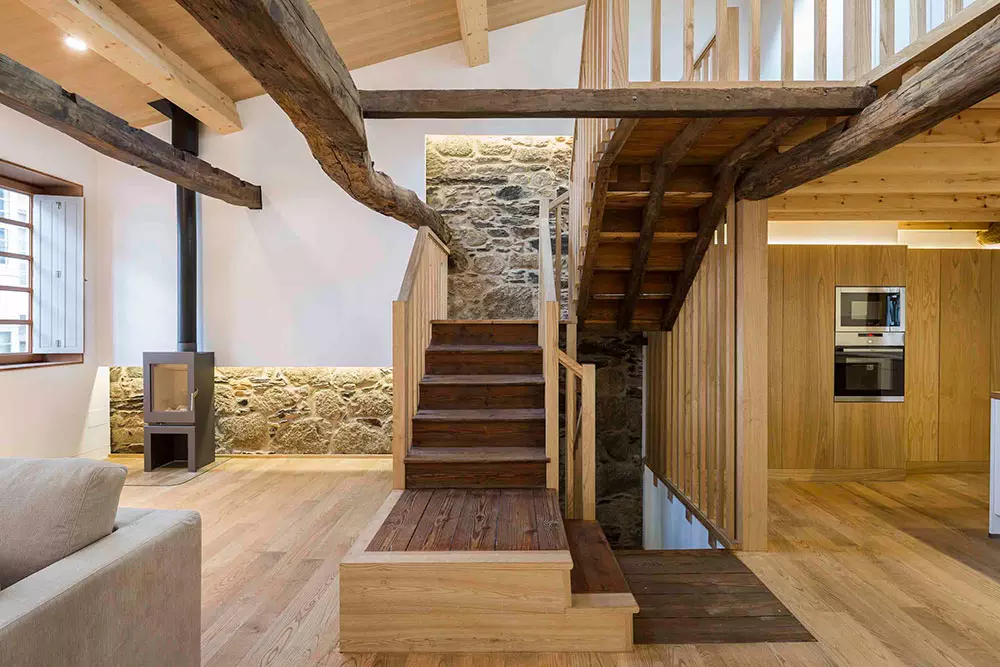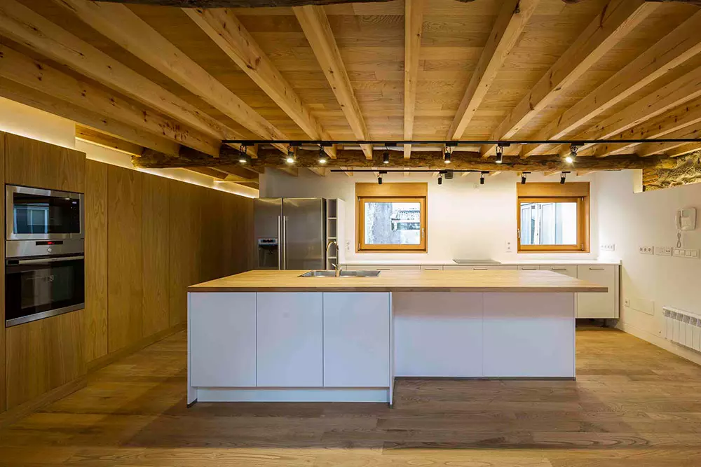 Conservamos la estructura existente al máximo y se convierte en protagonista de la obra. Conseguimos recuperar la madera de castaño de las vigas y también en la preciosa escalera. El tratamiento de aceite en las maderas nuevas y antiguas da un aspecto muy táctil a toda la obra. La pátina aparecerá en todos estos elementos acercándose los tonos entre las partes nuevas y antiguas de la obra. Creamos huecos en el trasdosado de cartón yeso para poder exponer la piedra y el ladrillo, así mostramos la historia del edificio durante su evolución y crecimiento a lo largo del tiempo.