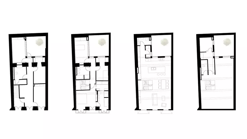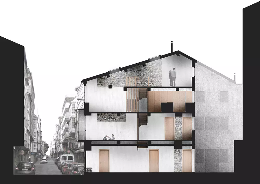 Al igual que las antiguas viviendas de parcela gótica, la planta baja tiene un uso profesional por parte del joven matrimonio. Las tres plantas superiores son la vivienda. La planta primera es la zona de noche mientras que las dos superiores son la zona de día. En ellas se mezclan en planta y sección los usos de cocina, comedor, salón y zona de juegos de los niños en un espacio lo más abierto posible. La intención es fomentar al máximo el contacto entre los miembros de la familia en unos tiempos en los que tenemos la responsabilidad de fortalecer estas relaciones.