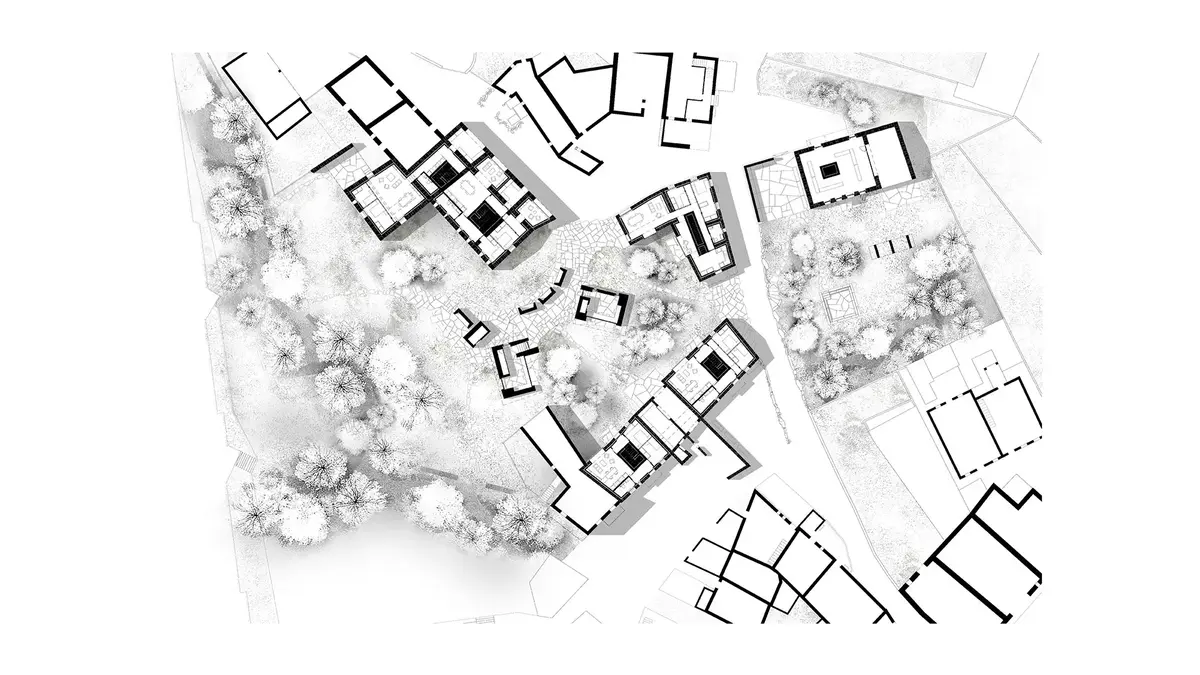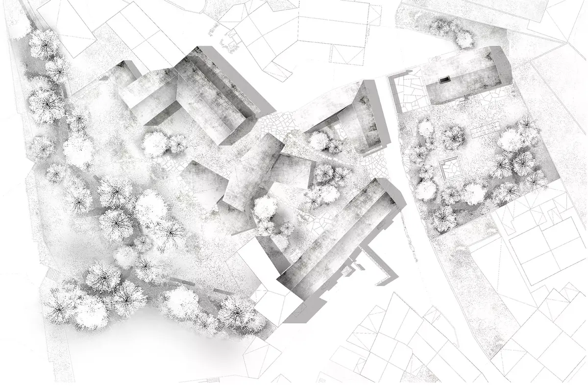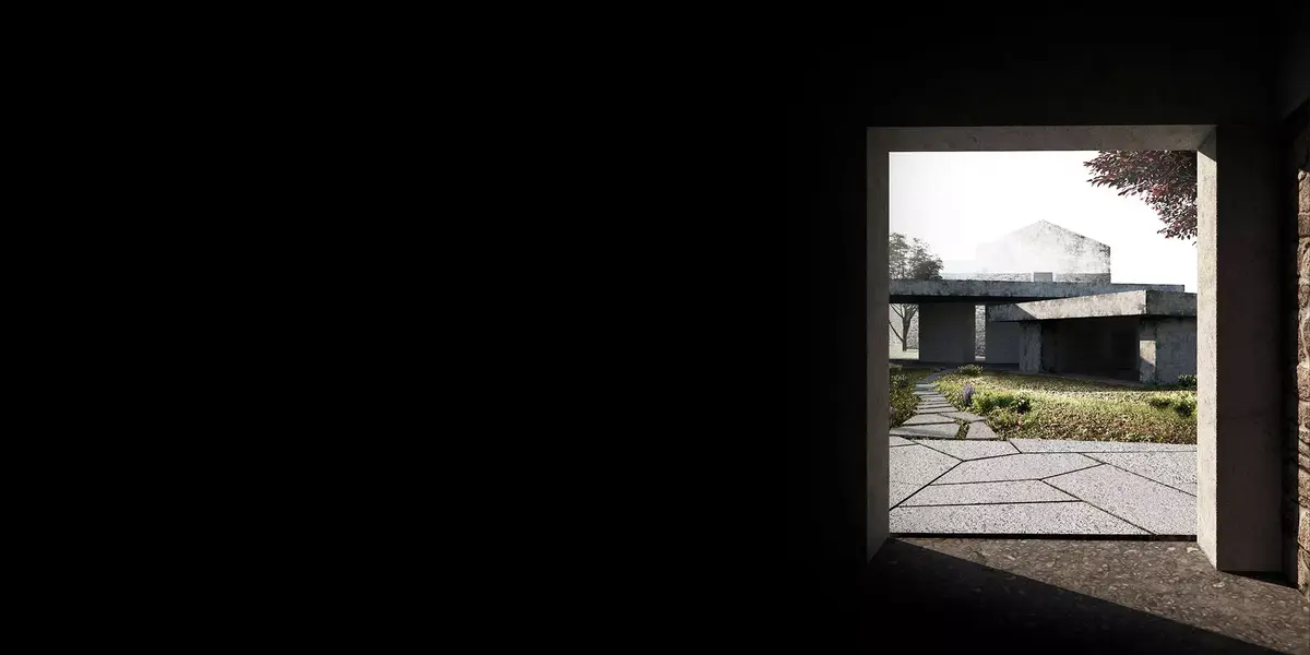 No interior dos volumes rehabilitados uns núcleos de formigón que organizarán o todo espazo. Estas estruturas terán unha relación moi directa cos volumes que se fincan e crean o espazo público no exterior. Estes espazos exteriores, que forman parte deste percorrido monolítico de acceso ao lugar, realízanse cun formigón máis bruto e rugoso. Esta sensación brutalista de arquitectura arcaica acentuarase a través da xeometría e os espesores destas pezas monolíticas que flotan sobre as nosas cabezas.