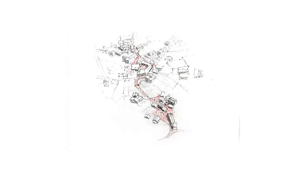A arquitectura debe intervir naqueles elementos que non se atopen en bo estado co fin de melloralos en favor do conxunto. Debido a isto, existe un punto deste percorrido descendente, no que, debido á deterioración das edificacións existentes e ás intervencións que se realizaron posteriormente, pérdese e se desdibuja esa bonita concatenación de rueiros e espazos comunais, propia do lugar. A actuación tratará de recuperar e dignificar as antigas e orixinarias construcións en mal estado, permitindo así, volver establecer unha relación a ambas as marxes do eixo descendente e co resto do núcleo rural. Tentarase reducir a intervención a un único elemento, que tratará de colonizar o lugar e de abrazar a antiga arquitectura respectándoa e poñéndoa en valor. O formigón é este novo elemento, a nova pedra de hoxe en día, que dará unidade e creará un conxunto co mesmo linguaxe.